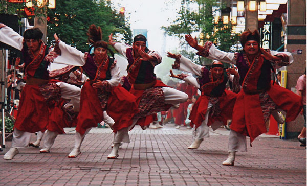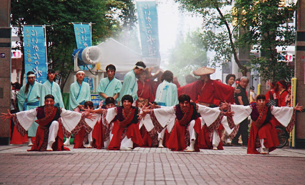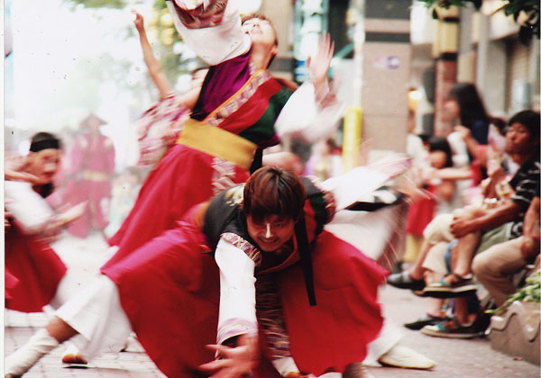 腰巻のハンカチーフヘムや袖口のフレアーが、演舞の時に弧を描く様にフォルムとフレアー分量を調整したデザインです。
